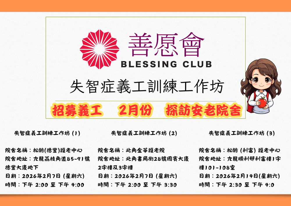 活動正在進行中 最新活動資訊 最新活動資訊閒話家常,幸福傳『信』創作比賽 2025 年 10 月 7 日 0詳細閱讀招募義工活動 最新活動資訊招募義工 失智症義工訓練工作坊 探訪安老院舍 (2月份) 2026 年 1 月 14 日 0歡迎大家繼續參與和支持我們的失智症預防活動。二月份的活動時間安排如下,敬請報名,一同服務長者。 失智症義工訓練…詳細閱讀招募義工活動 最新活動資訊招募義工 失智症義工訓練工作坊 探訪安老院舍 (1月份) 2025 年 12 月 22 日 0如果你抽到空又想去學習一下失智症嘅訓練活動,歡迎參加我們這個月的探訪訓練詳情如下: 失智症義工訓練工作坊 (1…詳細閱讀最新活動資訊癌症病患者康復計劃 2025 年 12 月 15 日 0隨着癌症嘅發生機率同年輕化,我們必須正視患者康復之路。希望為癌症病患者提供一個全面嘅支援。 主要服務包括下列三…詳細閱讀招募義工活動 最新活動資訊招募義工 開心快樂拍拍拍 2025 年 12 月 14 日 0我哋嚟緊會喺一月安排長者拍照服務,在新年前為一眾長者拍下賞心悅目的單人照和歡樂溫馨的家庭照。你有冇興趣一齊幫手…詳細閱讀1 2 3 … 19 Next 服務提供